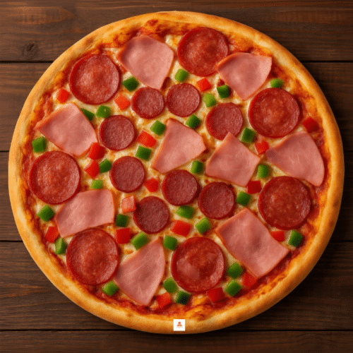 Tomatensaus, mozzarella, olijven, salami, hesp, paprika, champignons, oregano.